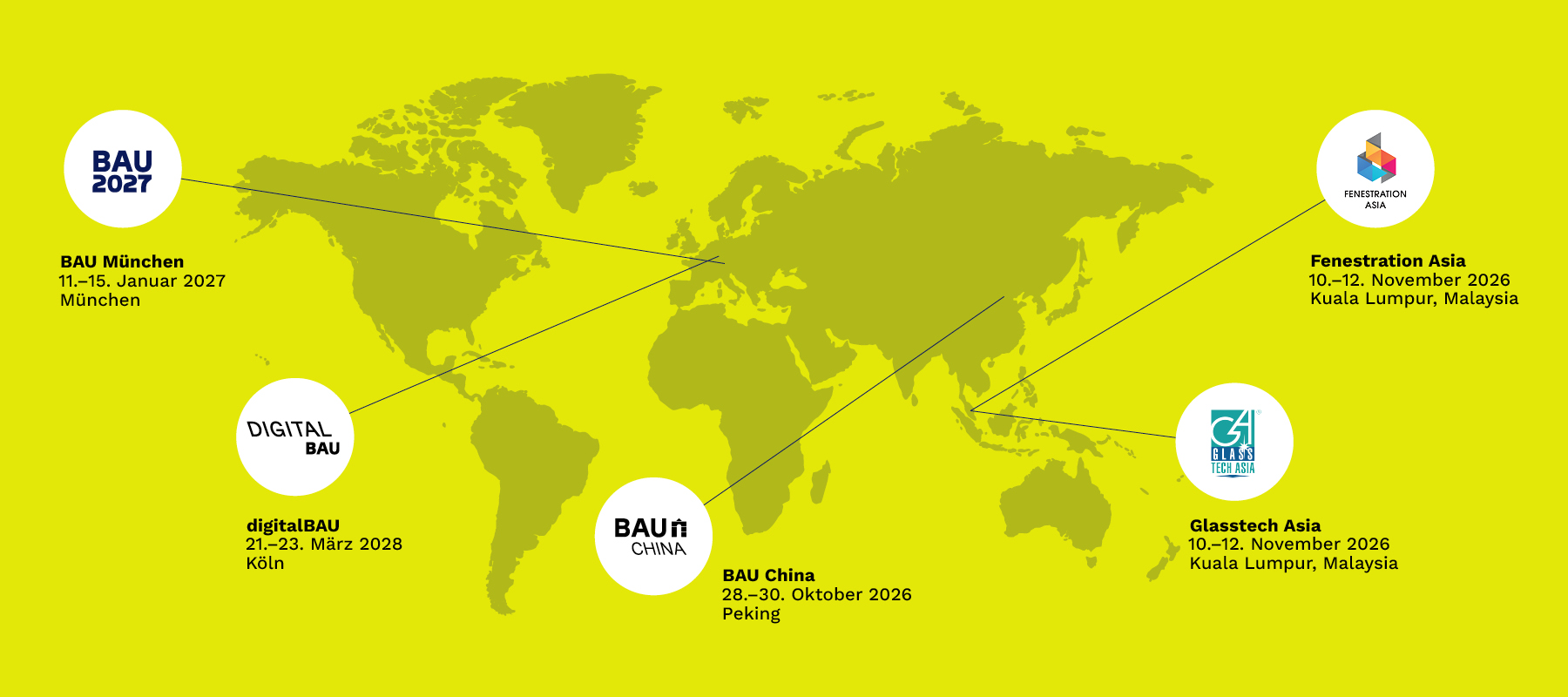 Die BAU, Weltleitmesse für Architektur, Materialien und Systeme, vereint im BAU Network weitere Messeformate zu relevanten Fokusthemen der Baubranche.