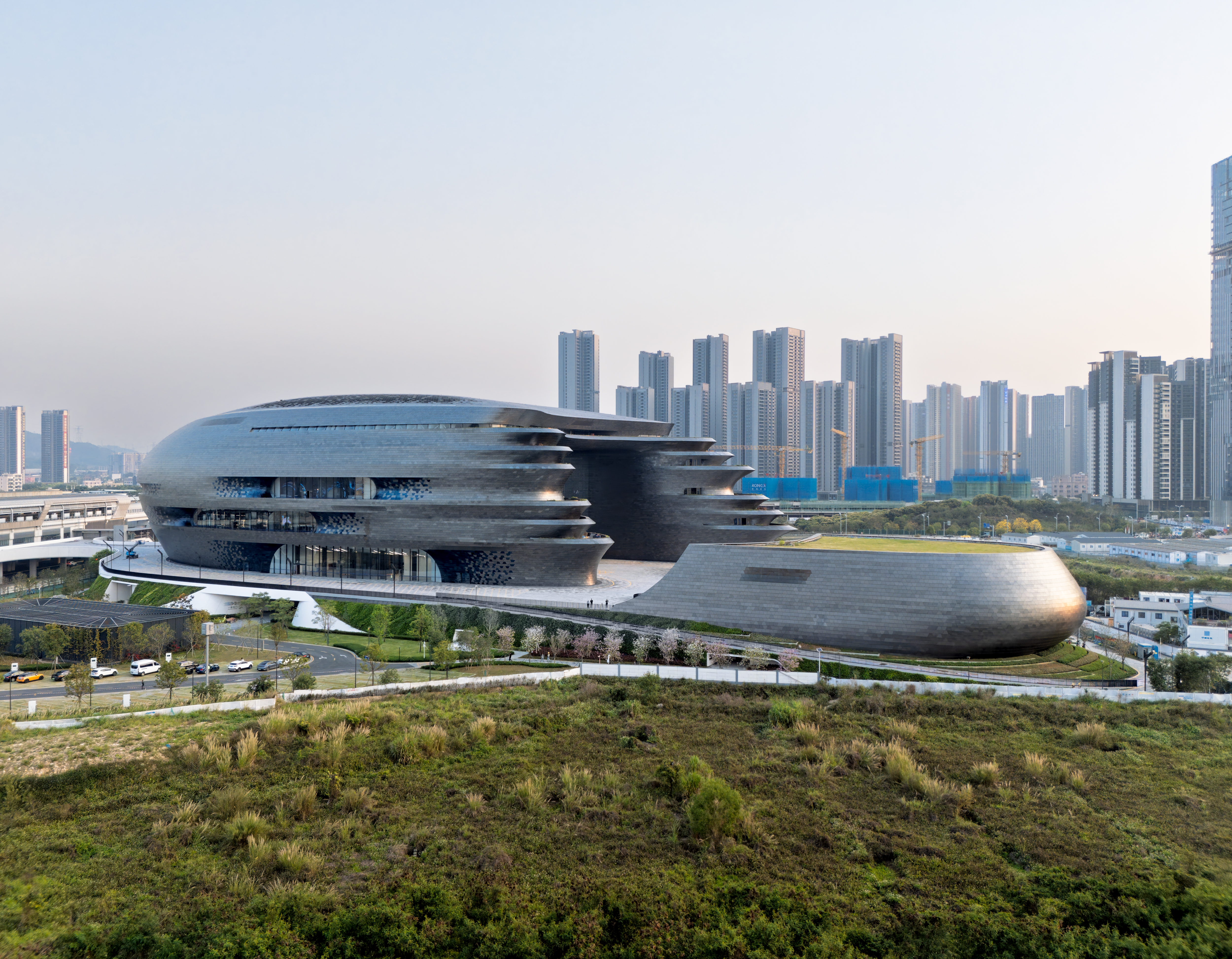 Designed by Zaha Hadid Architects, the Shenzhen Science & Technology Museum is conceived as a central hub for knowledge and innovation in the newly developing Guangming District. Located in close proximity to the metro station and serving as a link between the city and the science park, the building functions as an urban hinge. As a major attraction in the Greater Bay Area, it is also part of a regional network of technology companies, universities, and research institutions. The compact building facing the city establishes a clear urban anchor point, while the park-facing structure unfolds into a sequence of terraces and accessible levels. These interweave exhibition spaces, social areas, and landscape while simultaneously serving as a functional extension of the interior spaces organized around the atrium.